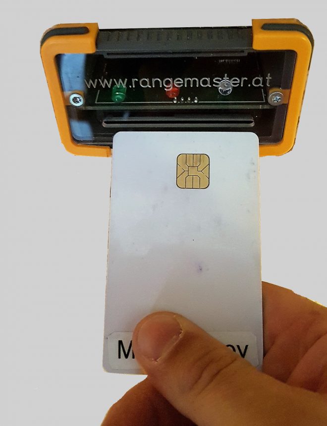 Chipkarte wird mit dem Chip nach oben und voran in den Kartenleser eingesteckt.