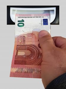Zum Aufladen der Chipkarte wird Bargeld (€-Scheine) in den aufblinkenden Geldscheinprüfer eingeführt. Sollte das Gerät die Annahme verweigern kann es sein, dass der Schein verknittert ist. Hier sollte man alle vier Ausrichtungen des Scheins ausprobieren.
